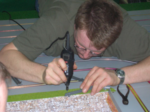 Jetzt muss "nur noch" die Kupferlitze aufgeklebt werden. Die Zusatzeinspeisungen sind gesetzt und Jens hat auch "unter der Bahn" ganze Arbeit geleistet und die Hauptstromleitungen vorbildmäßig verlegt. Der Raum ist mittlerweile auch schon mit Teppich ausgelegt, denn die "Dreckarbeiten" sollten abgeschlossen sein. Auch die Fahrerplätze sind vorbereitet (Netzteilaufnahme und Reglerablage)
