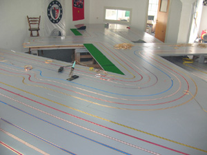 Ca. 480m Kupfertape sind aufzukleben damit die Autos auch ordentlich Kontakt bekommen, Die Einspeisungen werden verlötet und auch die 230V Verkablung zur Versorgung der Netzteile, des Zeitmesssystems und des Rechners will erledigt werden. Auch mit 3 Personen die nichts weiter machen als Kupfertape kleben sind hier 3 Basteltage bei drauf gegangen.